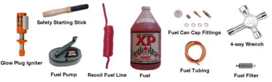 | Qty. | Part No. | Description | The table at the left shows our recommendations for the basic starting equipment required. Basically, you need fuel, a method of getting fuel from the fuel jug to the aircraft tank, a current source to heat the glowplug, a stick to flip the prop and protect your fingers, and a wrench to change your prop or glowplug. |